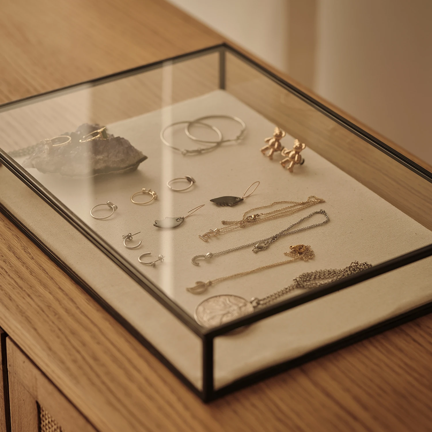 Cam Takı ve Aksesuar Kutusu | Keten tabanlı | Siyah | 35x25x5cm